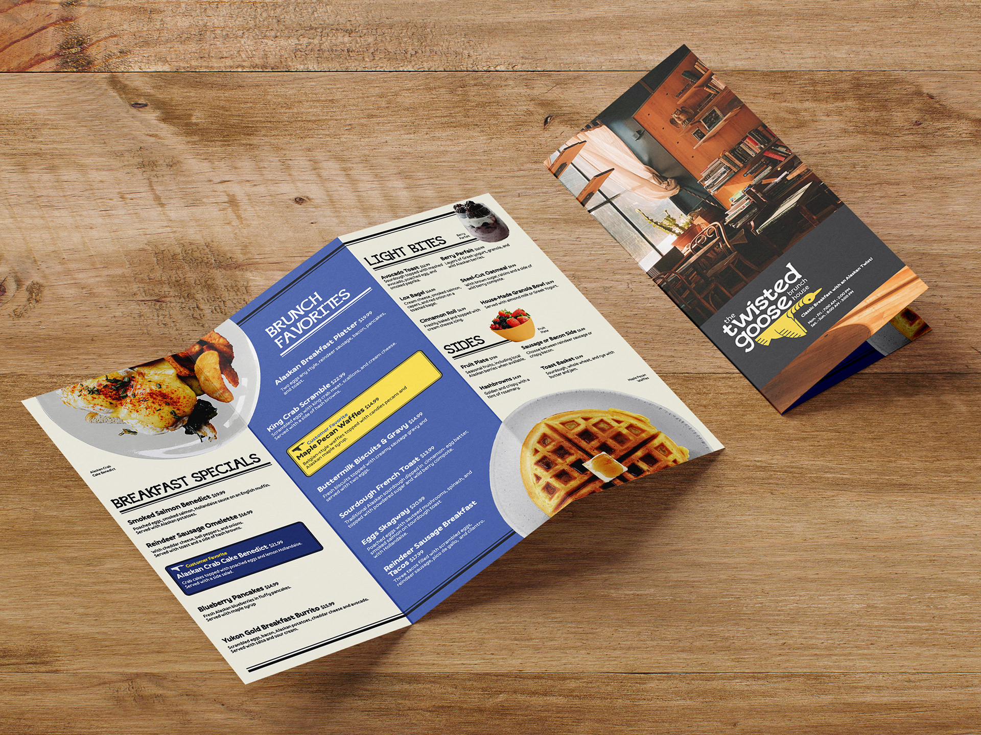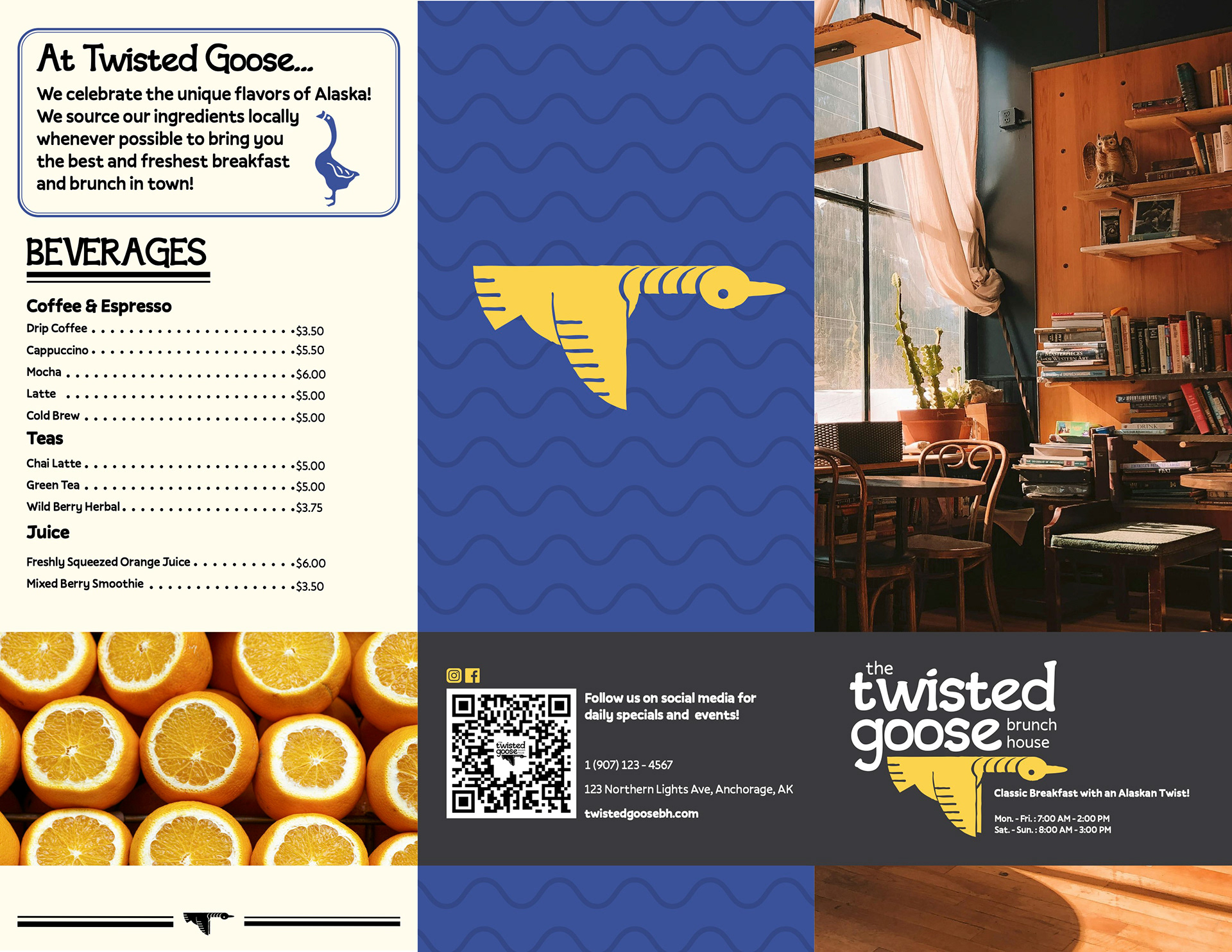 Create a tri-fold menu for a fictional restaurant, The Twisted Goose Brunch House.